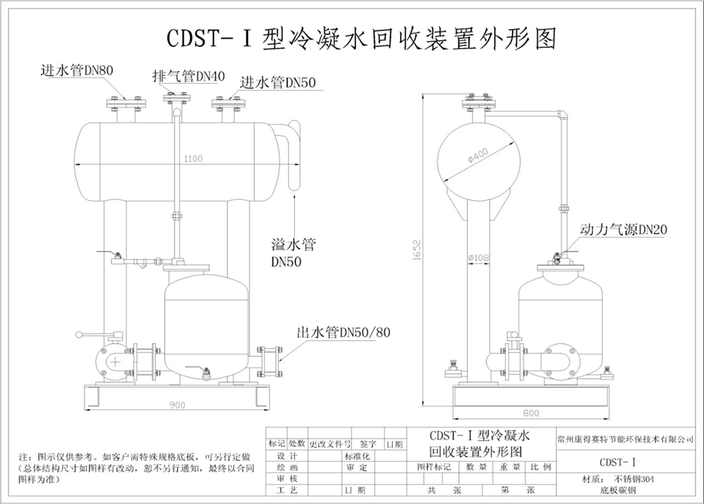 CDST-Ⅰ型冷凝水氣動回收組合泵裝置(除底板)均為不銹鋼304制作,包括內部機構,堅固防蝕。