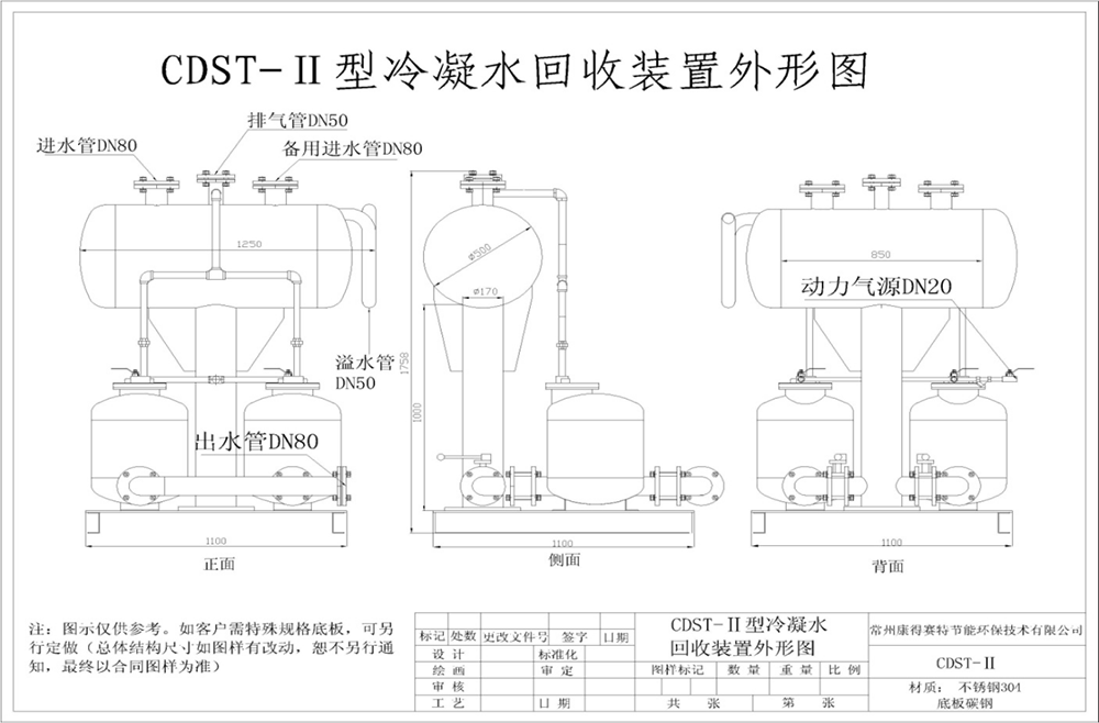 CDST-Ⅱ型冷凝水氣動回收組合泵裝置(除底板)均為不銹鋼304制作,包括內(nèi)部機構(gòu),堅固防蝕。