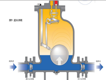 1、流體由進口止回閥進入泵體,使浮球升起。