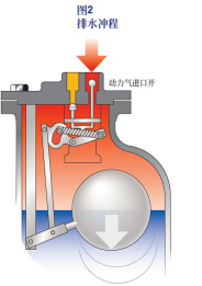 2.浮球隨著凝結水的流入而上升至排水點,聯動機構運作到與一步顯示相反的位置。